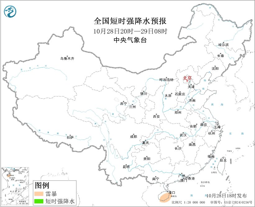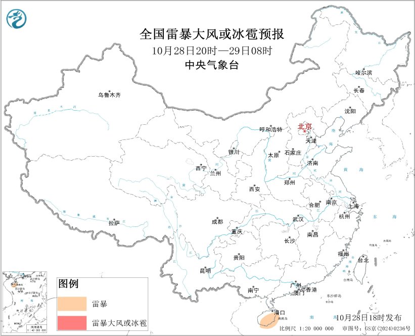 預(yù)計(jì)10月28日20時(shí)至29日20時(shí),海南島等地的部分地區(qū)將有雷暴天氣。