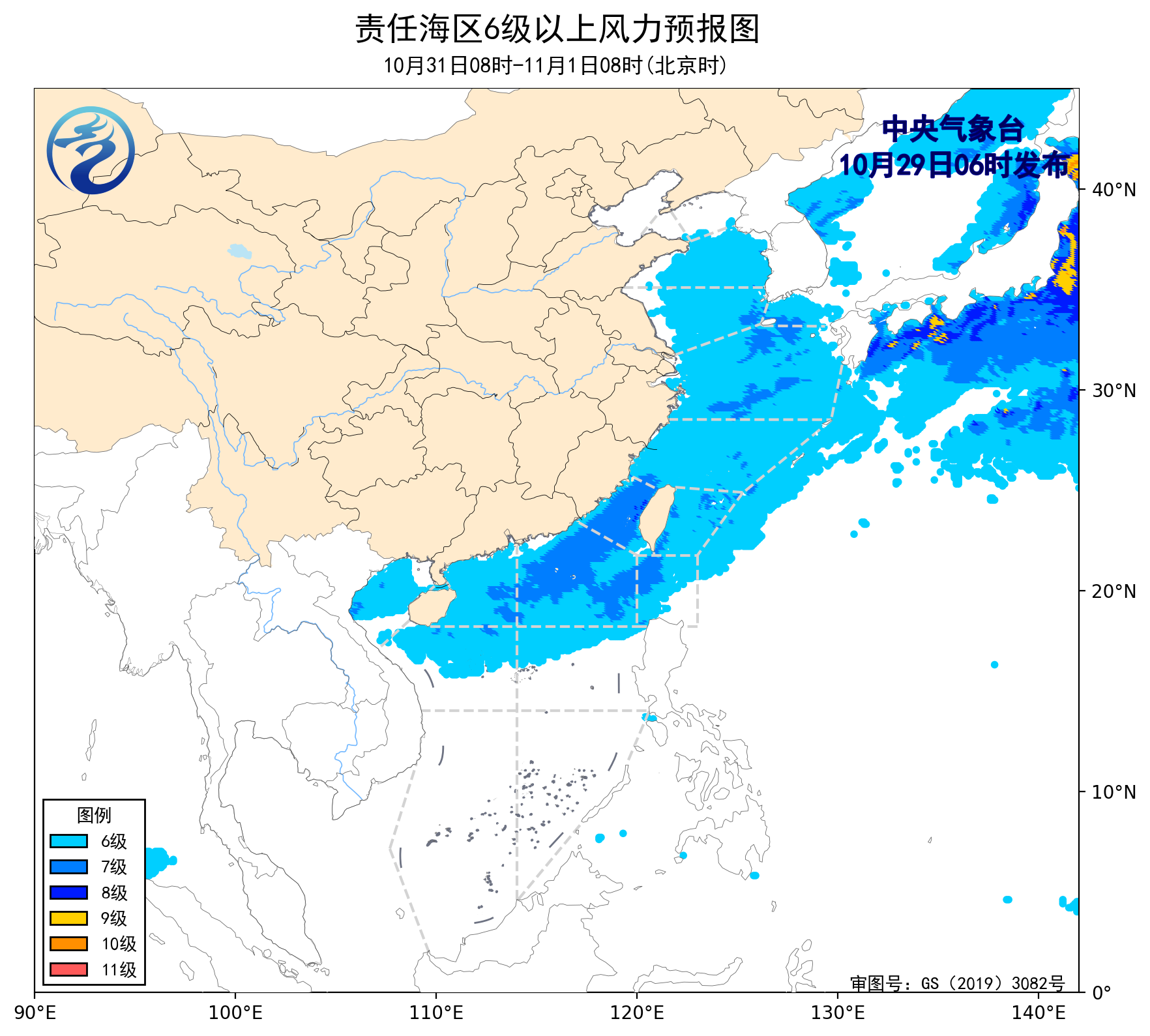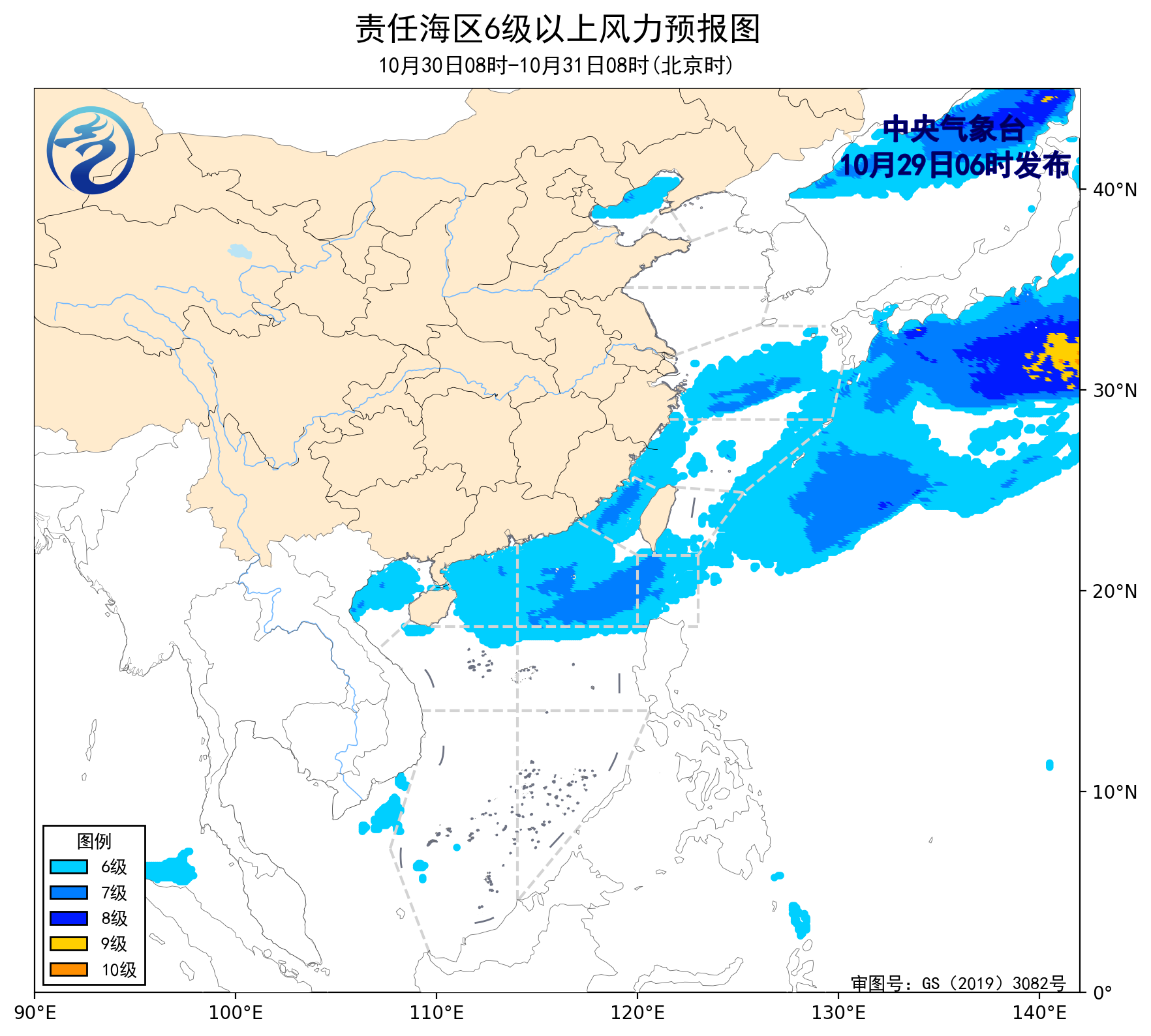 10月28日14時(shí)至29日02時(shí),東海北部海域、北部灣、南海中西部海域出現(xiàn)了5~7級(jí)、陣風(fēng)8級(jí)的東北風(fēng)或偏東風(fēng),東海南部海域、臺(tái)灣海峽、臺(tái)灣以東洋面、巴士海峽、南海北部海域出現(xiàn)了6~8級(jí)、陣風(fēng)9級(jí)的東北風(fēng)或偏北風(fēng)。