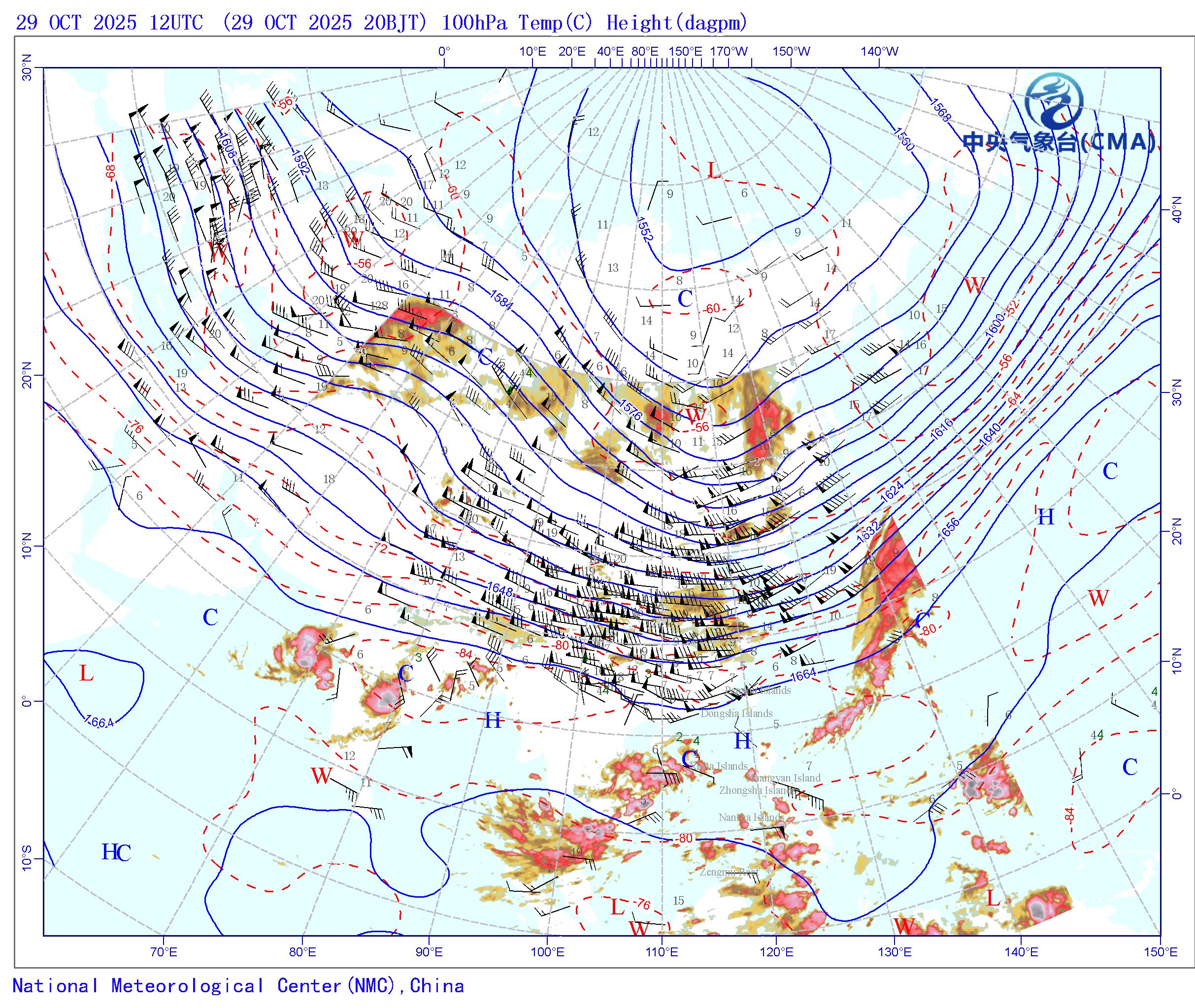 站點的填圖要素包括:風(fēng)向風(fēng)速和溫度露點差;天氣系統(tǒng)符號包括:高壓中心(H)、低壓中心(L)、暖中心(W)、冷中心(C)和臺風(fēng)符號;藍色等值線為等高線(單位dagpm);紅色等值線為等溫線(單位℃),其中零攝氏度以下以虛線顯示;底層填色為地形高度;頂層填色為紅外衛(wèi)星云圖。