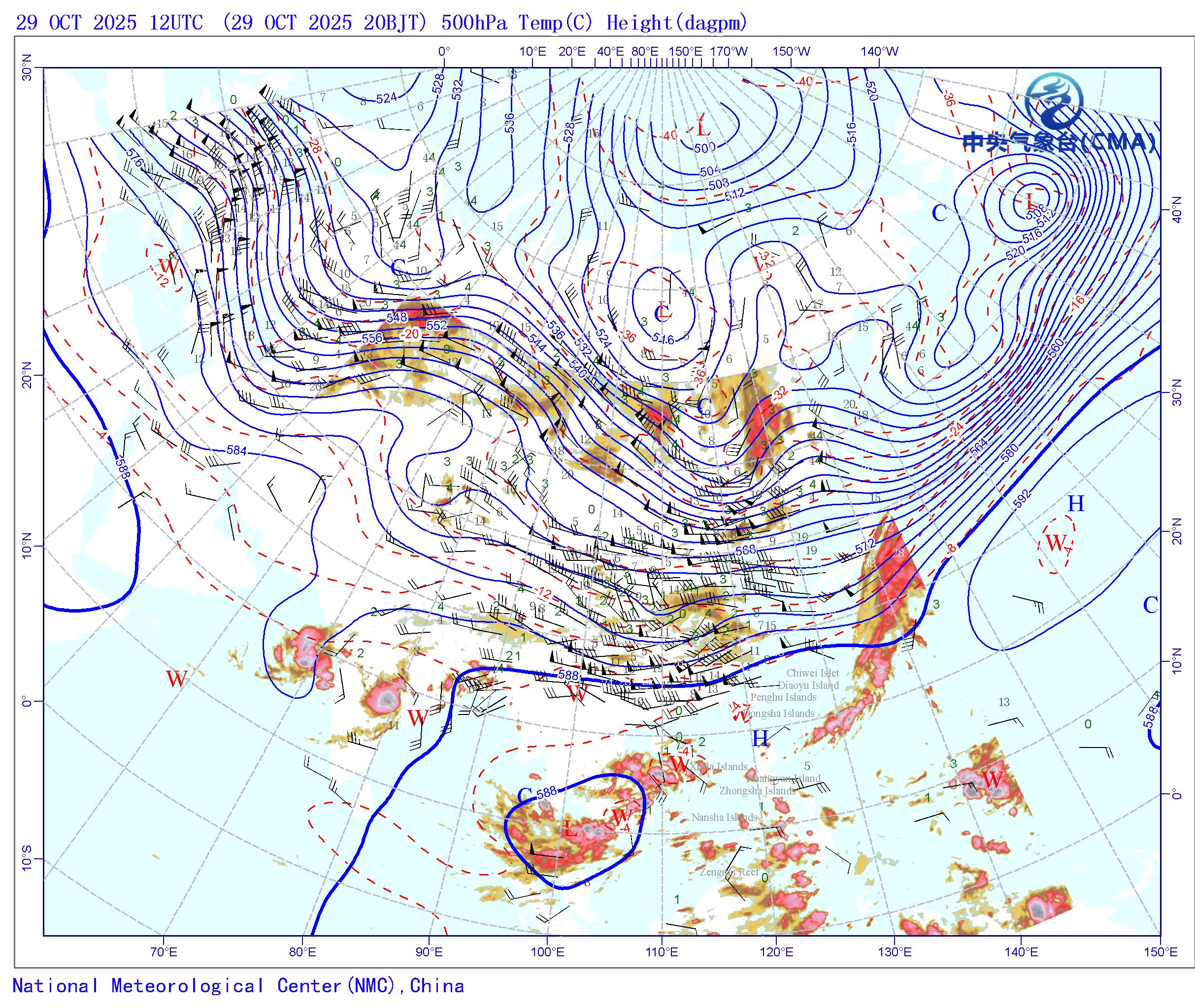 站點的填圖要素包括:風向風速和溫度露點差;天氣系統符號包括:高壓中心(H)、低壓中心(L)、暖中心(W)、冷中心(C)和臺風符號;藍色等值線為等高線(單位dagpm);紅色等值線為等溫線(單位℃),其中零攝氏度以下以虛線顯示;底層填色為地形高度;頂層填色為紅外衛星云圖。