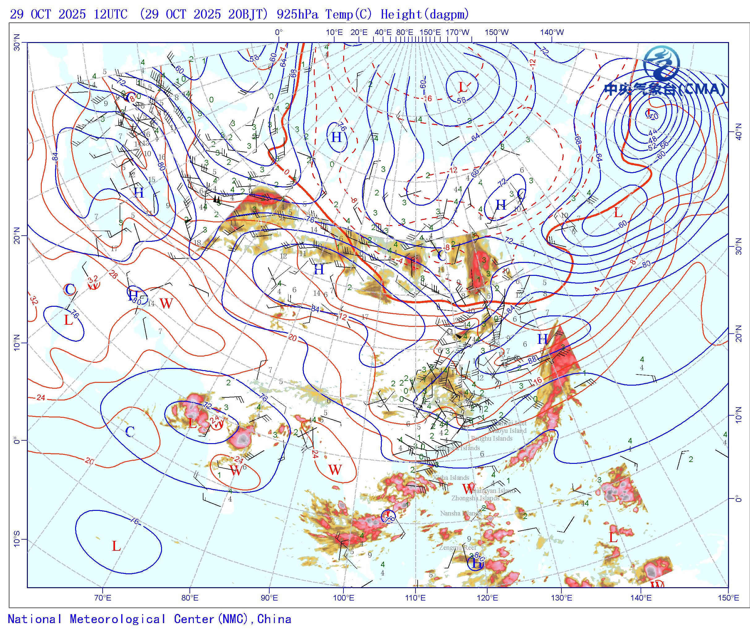 站點的填圖要素包括:風向風速和溫度露點差;天氣系統符號包括:高壓中心(H)、低壓中心(L)、暖中心(W)、冷中心(C)和臺風符號;藍色等值線為等高線(單位dagpm);紅色等值線為等溫線(單位℃),其中零攝氏度以下以虛線顯示。底層填色為地形高度;頂層填色為紅外衛星云圖。