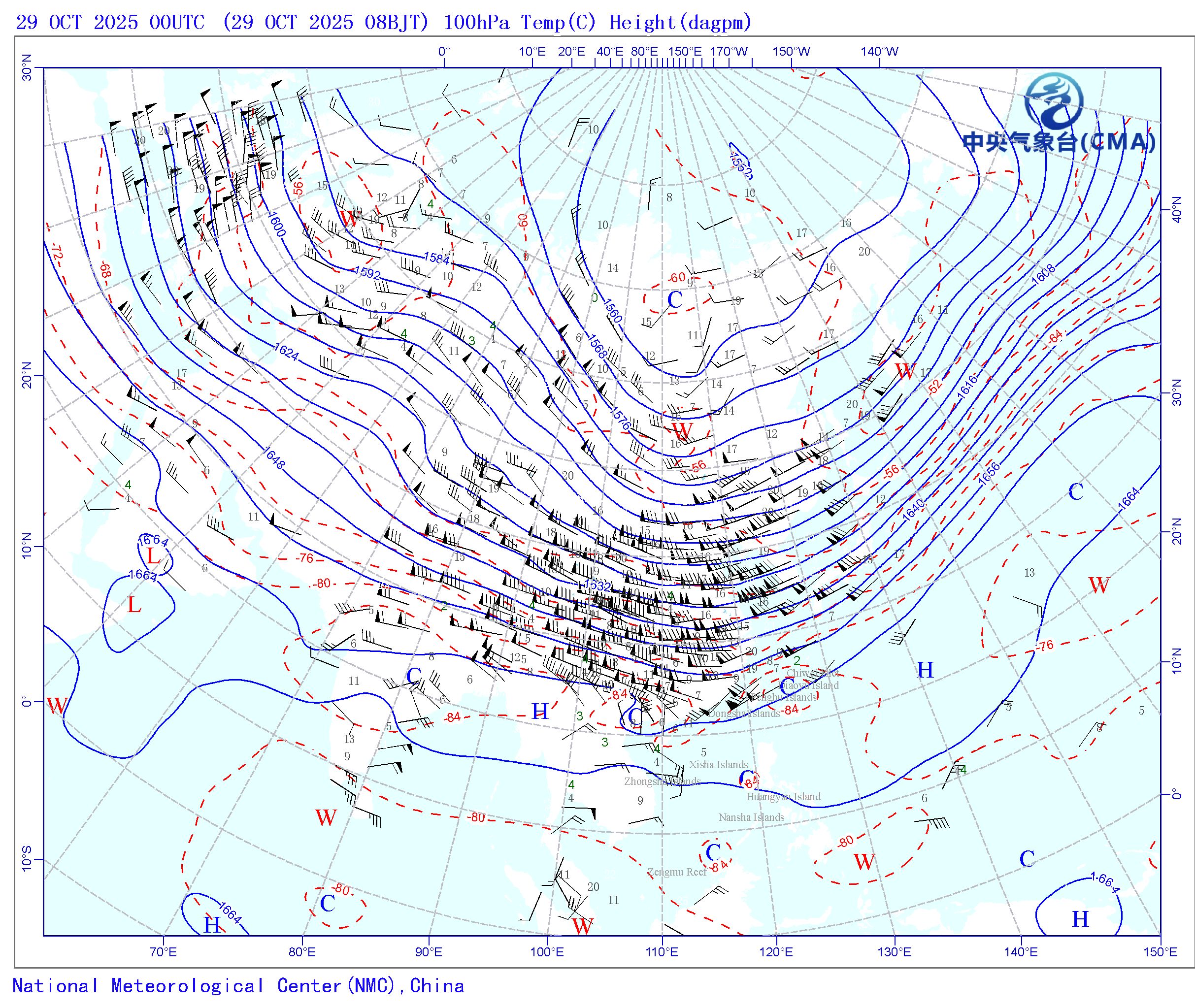 站點的填圖要素包括:風向風速和溫度露點差;天氣系統符號包括:高壓中心(H)、低壓中心(L)、暖中心(W)、冷中心(C)和臺風符號;藍色等值線為等高線(單位dagpm);紅色等值線為等溫線(單位℃),其中零攝氏度以下以虛線顯示。
