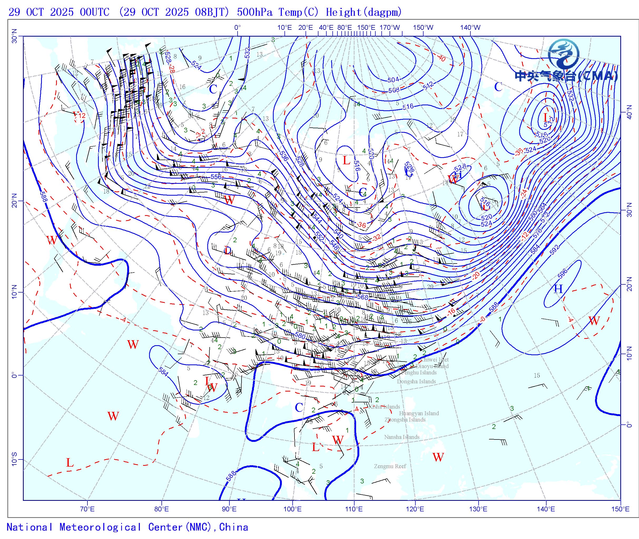 站點(diǎn)的填圖要素包括:風(fēng)向風(fēng)速和溫度露點(diǎn)差;天氣系統(tǒng)符號(hào)包括:高壓中心(H)、低壓中心(L)、暖中心(W)、冷中心(C)和臺(tái)風(fēng)符號(hào);藍(lán)色等值線為等高線(單位dagpm);紅色等值線為等溫線(單位℃),其中零攝氏度以下以虛線顯示。