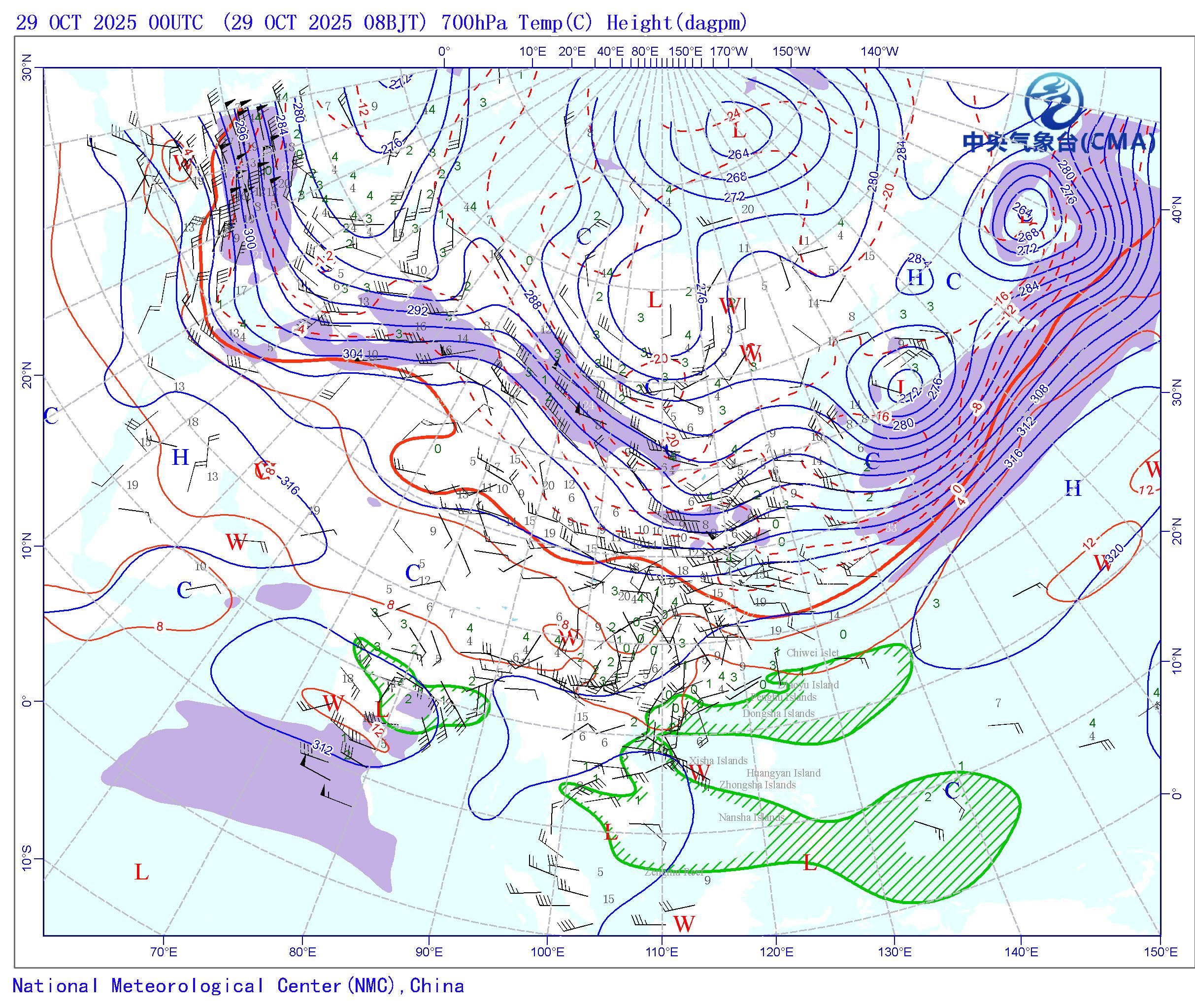站點的填圖要素包括:風向風速和溫度露點差;天氣系統符號包括:高壓中心(H)、低壓中心(L)、暖中心(W)、冷中心(C)和臺風符號;藍色等值線為等高線(單位dagpm);紅色等值線為等溫線(單位℃),其中零攝氏度以下以虛線顯示。紫色填充區為風速達16m/s的急流區;綠色線條為等比濕線,其柵格化一側為比濕達到9g/kg的區域;