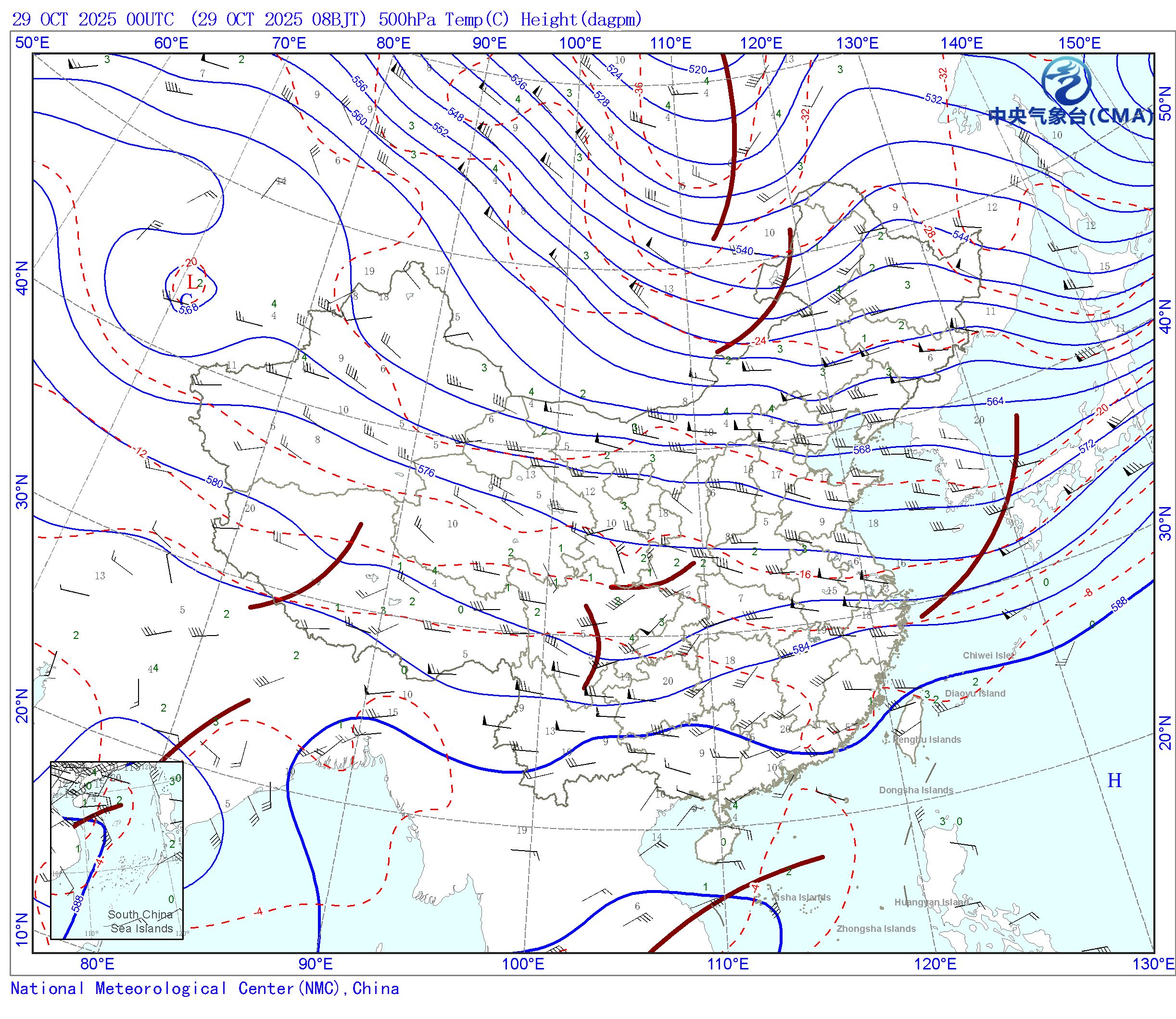 站點(diǎn)的填圖要素包括:風(fēng)向風(fēng)速和溫度露點(diǎn)差;天氣系統(tǒng)符號(hào)包括:高壓中心(H)、低壓中心(L)、暖中心(W)、冷中心(C)、槽線或切變線(棕色線段)和臺(tái)風(fēng)符號(hào);藍(lán)色等值線為等高線(單位dagpm);紅色等值線為等溫線(單位℃),其中零攝氏度以下以虛線顯示。