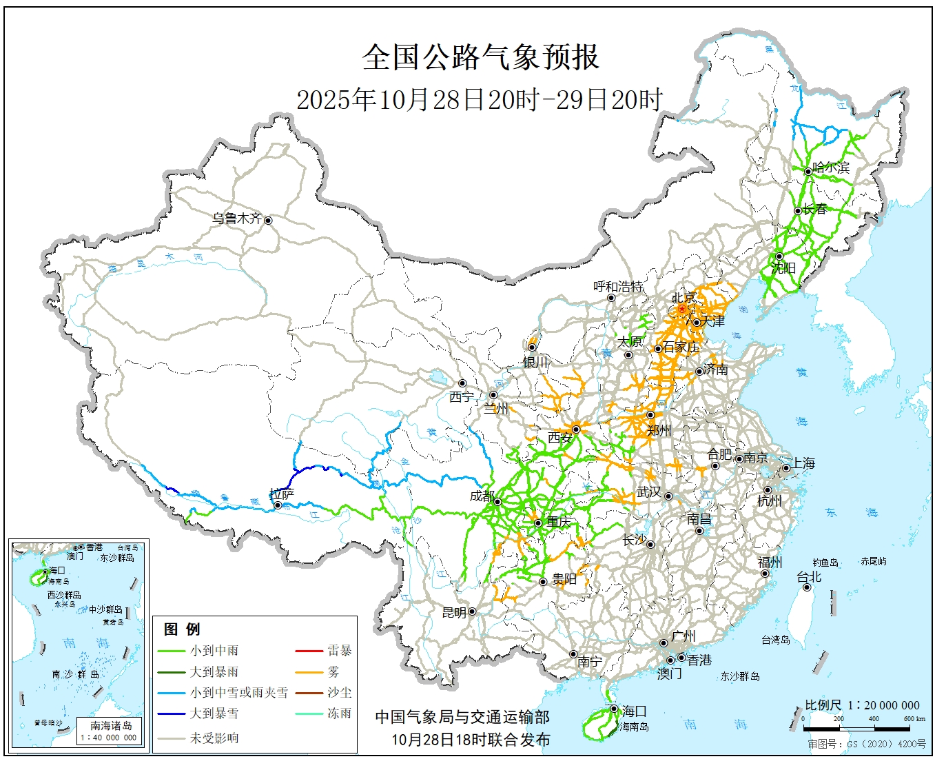 中國氣象局與交通運(yùn)輸部2025年10月28日聯(lián)合發(fā)布全國主要公路氣象預(yù)報(bào)