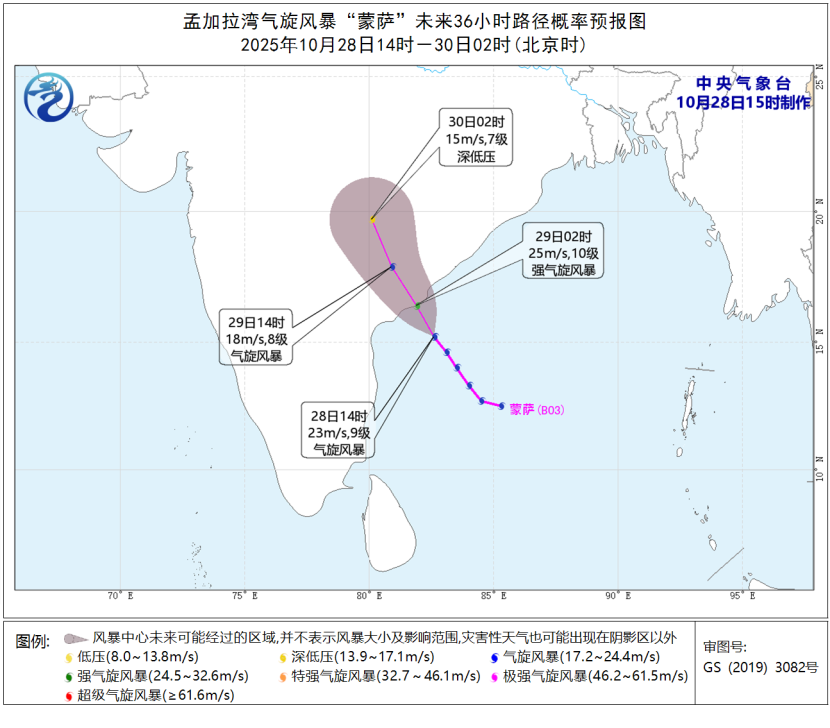 預報結論: 預計,“蒙薩”將以每小時15公里左右的速度向北偏西方向移動,強度逐漸增強,并將于28日夜間至29日早晨登陸印度安得拉邦東北部沿海(23~28米/秒,氣旋風暴或強氣旋風暴級)。受其影響,28日至29日,印度安得拉邦東北部沿海將有6~8級、陣風9級的大風,部分海域或地區的風力可達9~10級、陣風11~12級。10月28日~11月1日,印度半島東部自南向北將有一次中到大雨,部分地區暴雨,局地大暴雨的天氣過程。其中,印度東部、尼泊爾中東部、不丹西部、孟加拉國北部等地累計雨量可達30~80毫米,部分地區可達120~180毫米,局地超200毫米。