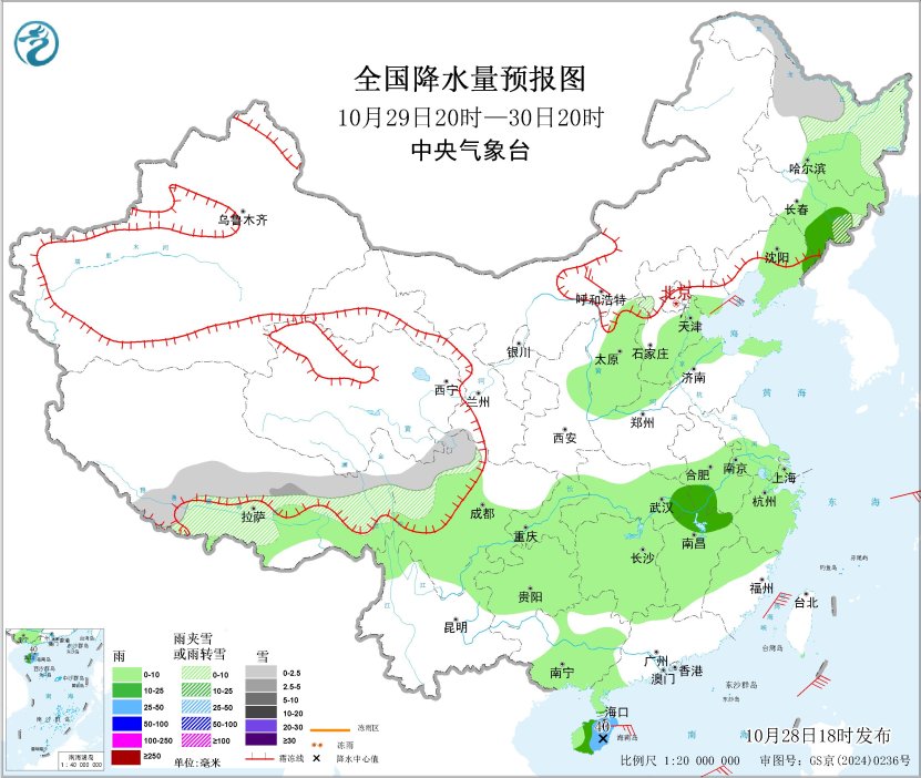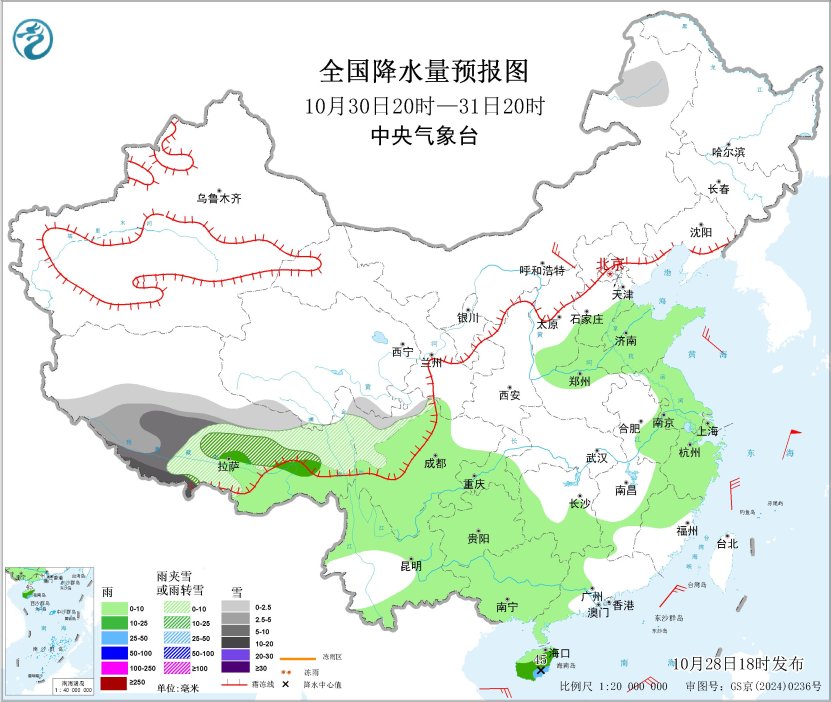 今天白天,全國大部降水較弱,西藏西南部等地出現雨雪天氣。10月29日至11月2日,青藏高原東部有持續雨雪天氣,部分地區有大到暴雪,局地有大暴雪,關注對交通運輸、設施農業等的影響。28日夜間至29日,華北中南部、黃淮西部等地部分地區有霧或霾天氣,關注對人體健康、交通運輸等的影響。